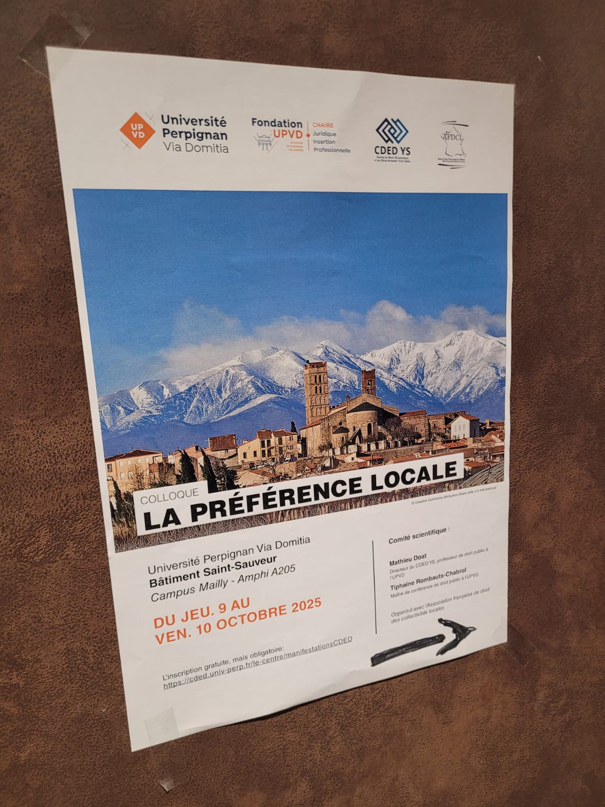 Les 9 et 10 octobre derniers ont eu lieu, à l’Université de Perpignan, les journées d’études annuelles de l’AFDCL, consacrées à la préférence locale. Ces dernières étaient organisées cette année par Mathieu Doat, Professeur à l’UPVD, et Tiphaine Rombauts-Chabrol, Maître de conférences à l’UPVD. L’AFDCL tient à les remercier chaleureusement, ainsi qu’Ophélia Basteiro, Gestionnaire administrative et financière du Centre de droit économique et du développement Yves Serra.